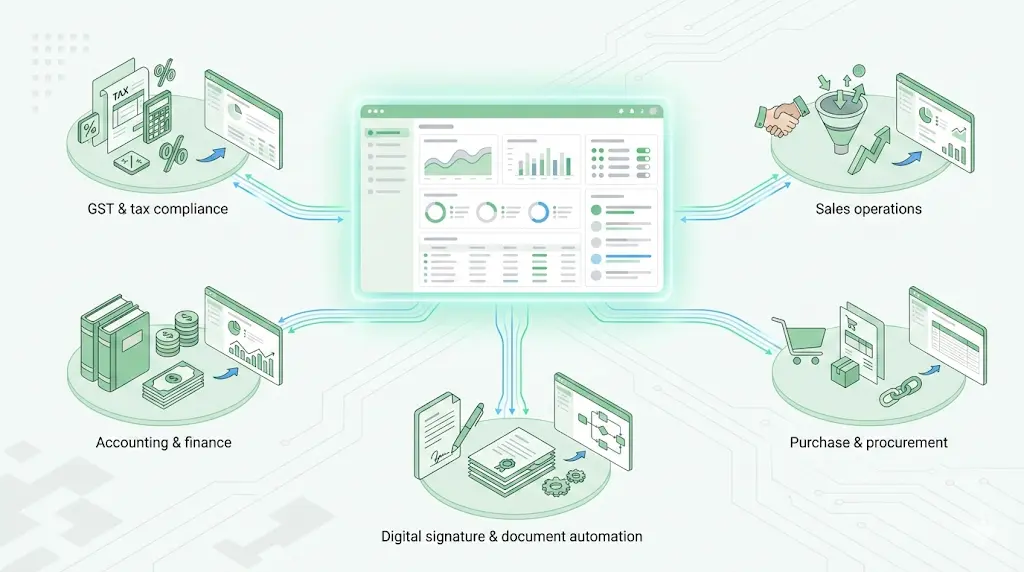 All-in-One ControlManage GST, accounting, sales, purchase, and compliance processes from a single unified SAP cockpit — no switching between multiple tools or portals.